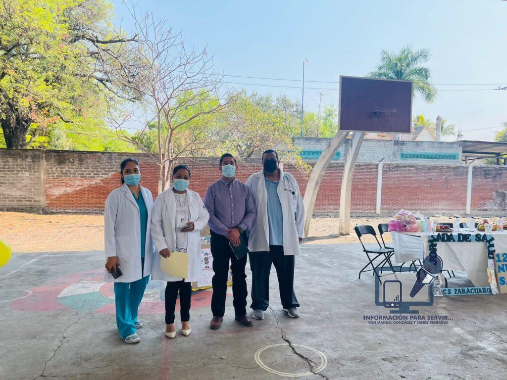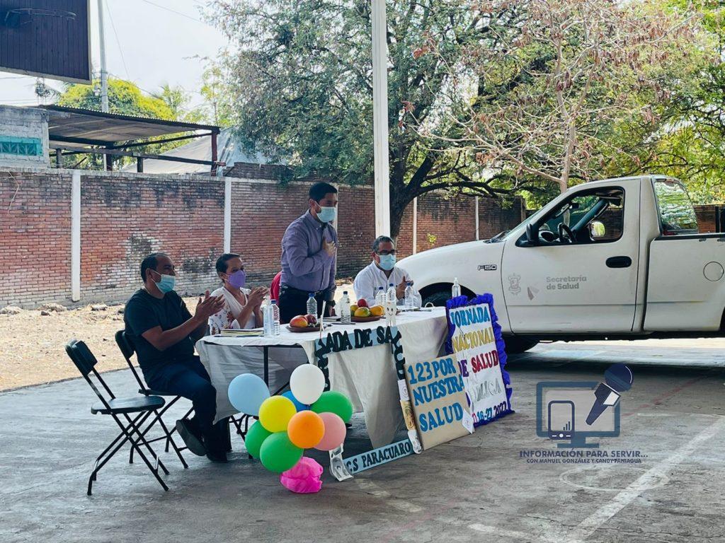 Durante su visita a Parácuaro el Dr. Abraham Espinoza Villa encabezo junto con la Presidenta del DIF, Licenciada Patricia Guizar Gutiérrez, el acto que enmarco el arranque de las actividades de la Jornada Nacional de Salud Pública que tuvo lugar en la escuela Emiliano Zapata a cuyo director, Profesor José Carlos Cuevas agradeció por su hospitalidad y por su disponibilidad para poner en marcha estas importantes actividades en dicha institución educativa.