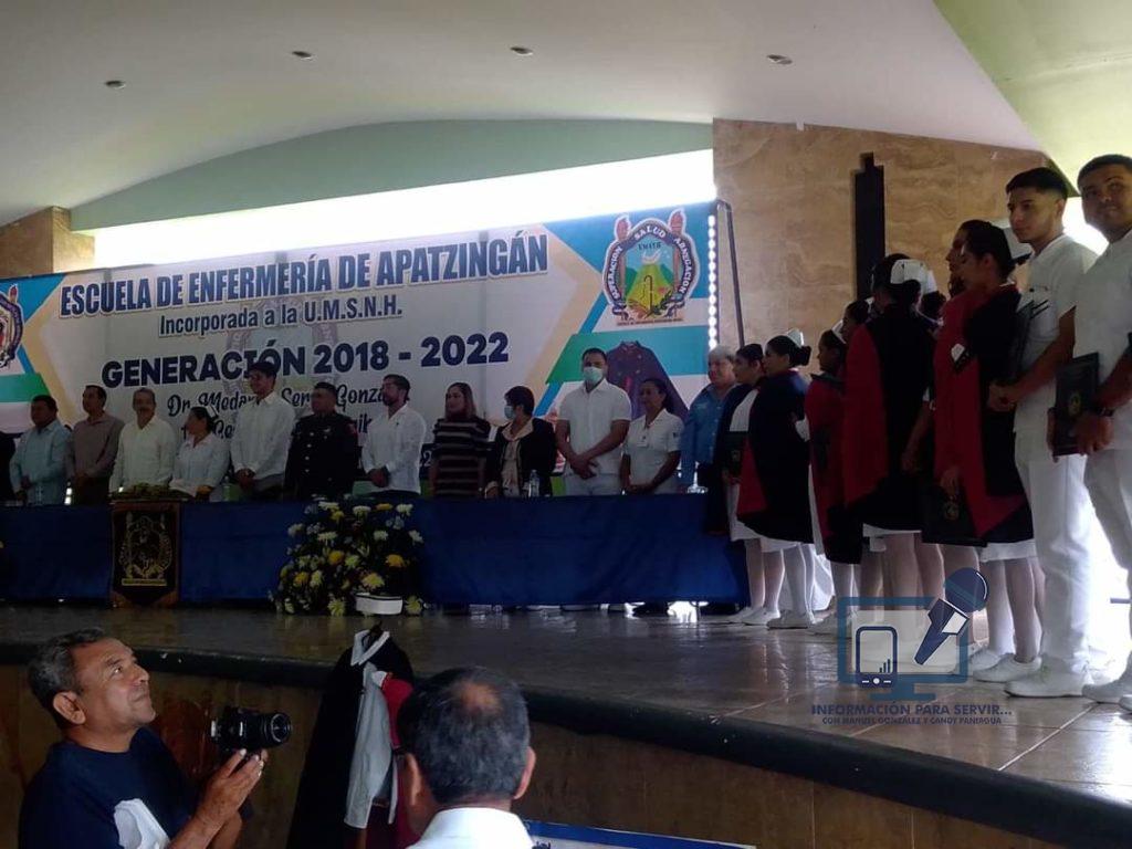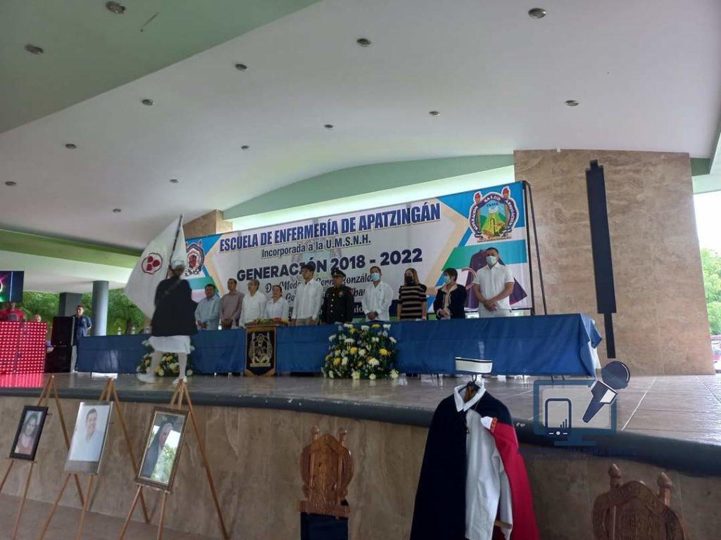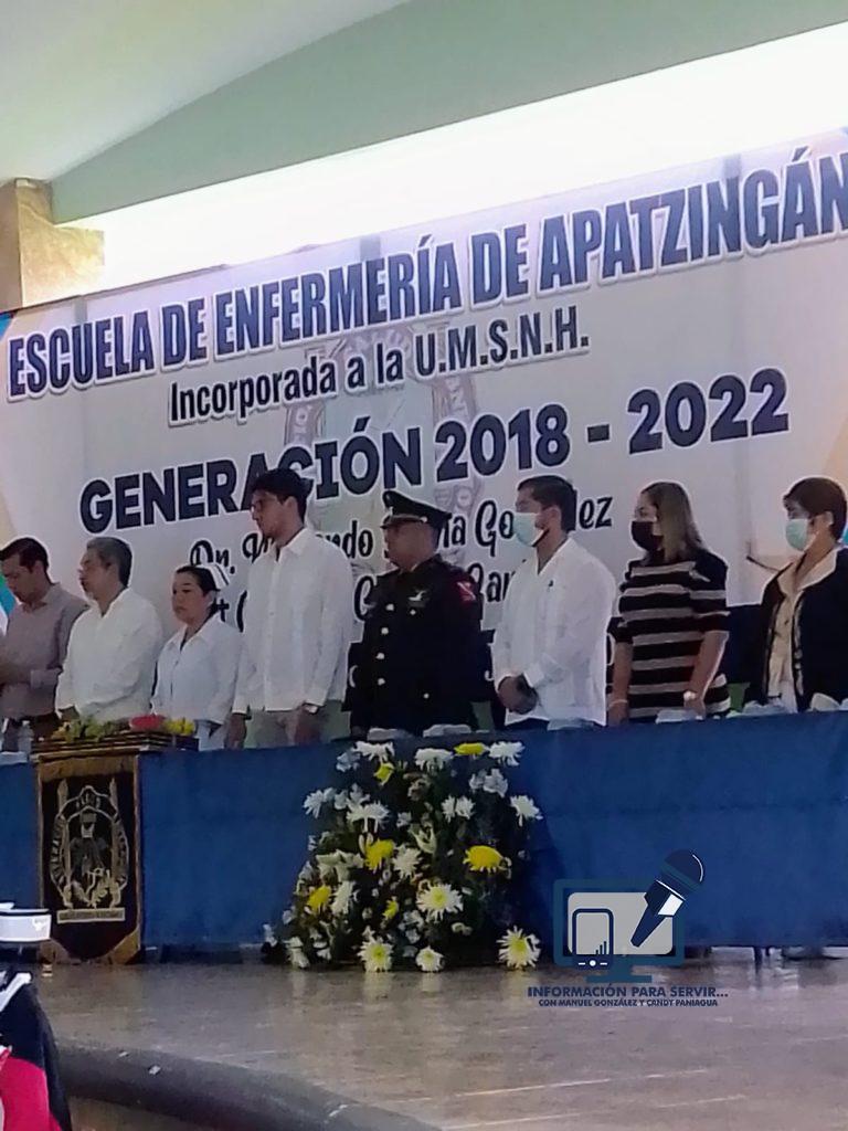 APATZINGAN, MICH., 29 DE JUNIO DE 2022.- Con la representación del Gobernador del Estado, Alfredo Ramírez Bedolla y al Secretario de Salud de Michoacán, Dr. Elías Ibarra Torres, el Jefe de la Jurisdicción Sanitaria 07, Dr. Abraham Espinoza Villa presidio, la ceremonia de clausura de la Escuela de Enfermería, de la que egreso, la Primera Generación de Licenciados en Enfermería 2018/2022 que llevó como nombre, “Cesar Chávez Garibay”.