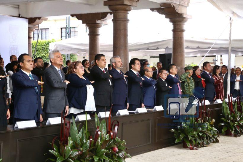 Estuvieron presentes el secretario de Gobierno, Carlos Torres Piña; Julieta García Zepeda, presidenta de la Mesa Directiva del Congreso del Estado; Adrián López Solís, Fiscal General del Estado; Jorge Reséndiz García, presidente del Supremo Tribunal de Justicia y del Consejo del Poder Judicial del Estado de Michoacán, senadores, diputados federales y estatales, entre otros.