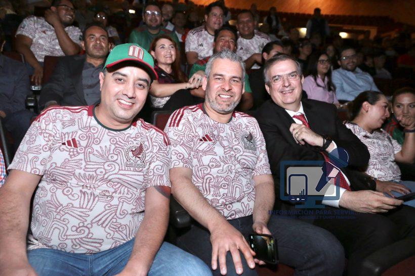 Morelia, Michoacán, 26 de noviembre del 2022 El teatro Morelos se «encendió» con aplausos y porras en apoyo a la selección Mexicana desde las 12:40 horas. El gobernador Alfredo Ramírez Bedolla; el secretario de Relaciones Exteriores del Gobierno de México, Marcelo Ebrard; la presidenta honoraria del Sistema DIF Michoacán, Grisel Tello Pimentel, y cientos de aficionados estuvieron presentes.