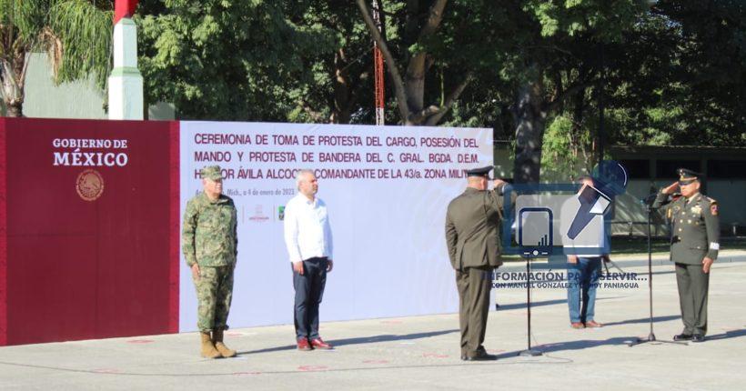 En dicho acto que presidió el Comandante de la XII Región Militar, General de Brigada DEM Enrique Covarrubias López, el Gobernador del Estado, Alfredo Ramírez Bedolla, Alcaldes de la Región Apatzingán e invitados especiales, el General de Brigada DEM Héctor Ávila Alcocer toma posesión como Comandante de la 43/a. Zona Militar acto forma parte de la política de rotación del personal militar, llevada a cabo por parte de esta Secretaría de Estado del Ejecutivo Federal, con la finalidad de que los mandos de las diversas jerarquías ocupen diferentes cargos durante su trayectoria Militar.