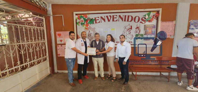 La dependencia hizo entrega de placa de certificación como Escuela Promotora de Salud a la Secundaria Técnica No. 5 de Apatzingán, donde se beneficiarán de manera directa 3 mil 200 estudiantes, 60 profesores y directivos adscritos al plantel.