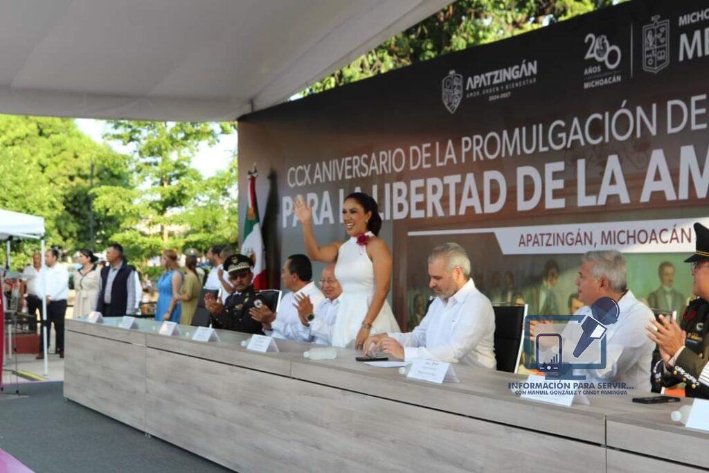 Acompañada por gobernador del Estado, Alfredo Ramírez Bedolla así como representantes de los tres niveles de gobierno, la alcaldesa del municipio, abundó que la Constitución de 1814 en sus 242 artículos nos hereda la soberanía nacional, el derecho a la autodeterminación, la democracia representativa, forma de gobierno que hoy conservamos con su división de poderes; nos heredan las garantías individuales, conocidas como ahora los derechos humanos, abundó la alcaldesa del municipio.