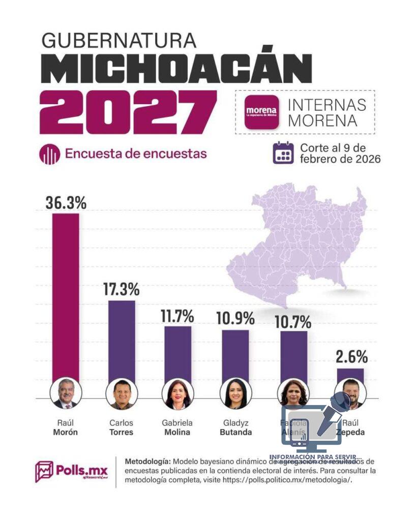 Morelia, Michoacán., a 09 de febrero de 2026.-Lo que inició como una medición de aspirantes se ha transformado en una carrera de un solo hombre. Raúl Morón sería el candidato de Morena a la gubernatura de Michoacán, según el más reciente análisis de Polls.mx, en el que el senador no solo lidera, sino que se ha vuelto matemáticamente inalcanzable para sus contrincantes.
