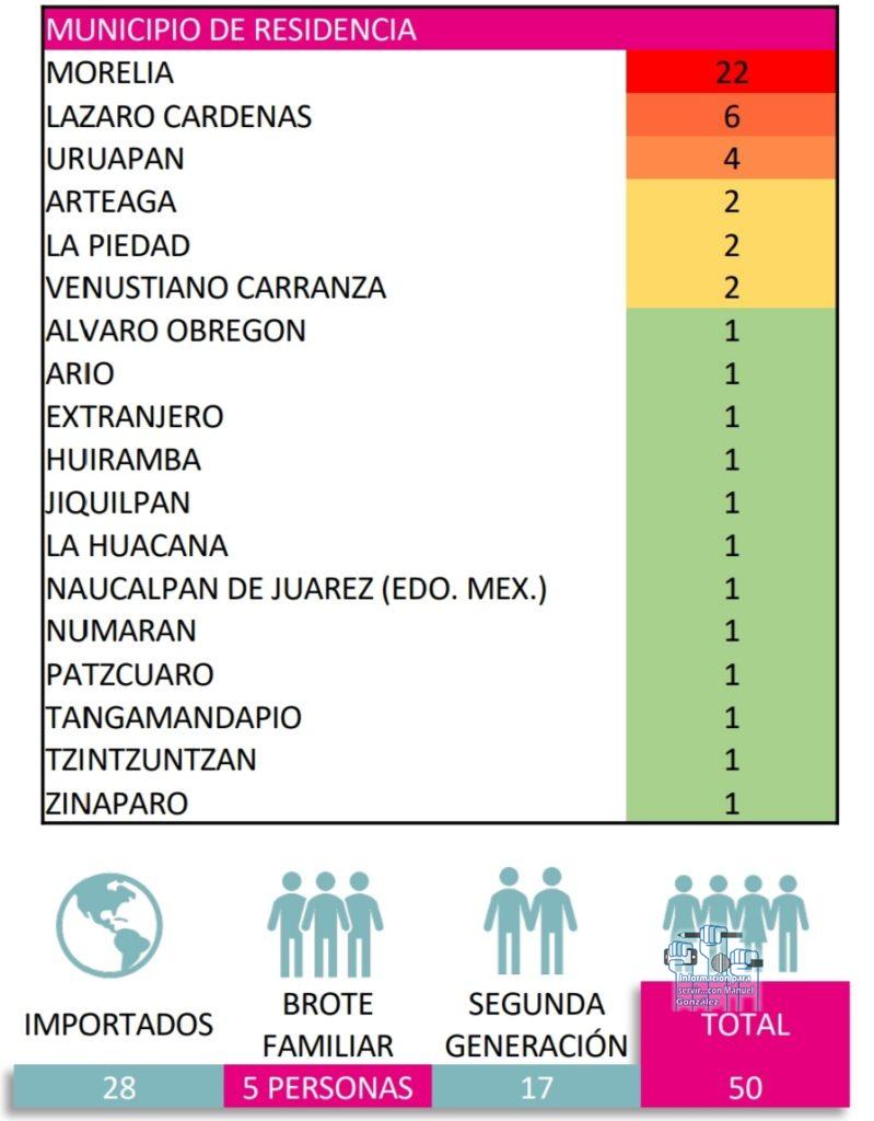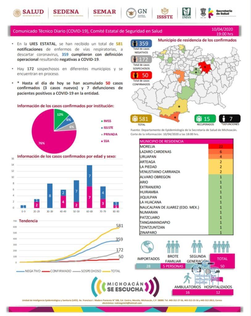 MORELIA, MICH., 10 DE ABRIL DE 2020. – De acuerdo al Comunicado Técnico diario COVID-19, del Comité de Seguridad en Salud, al 10 de abril de 2020, se registran 50 casos de COVID-19 confirmados en Michoacán así como 7 defunciones por esta causa en la entidad.