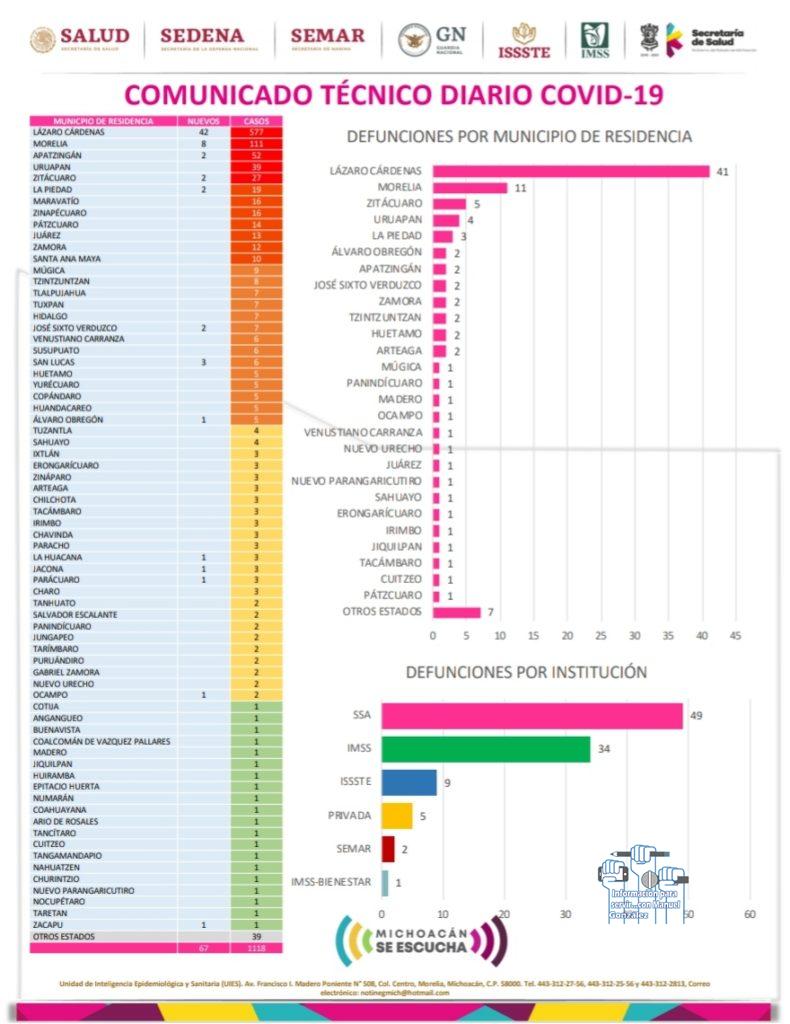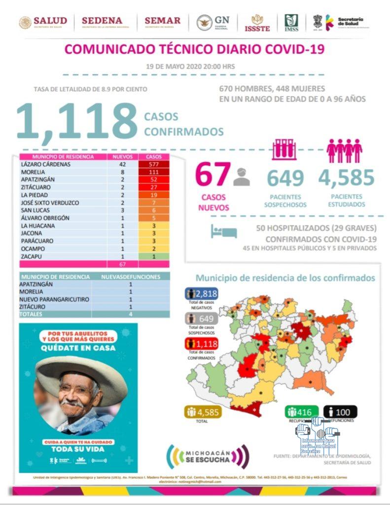 MORELIA, MICH., 19 DE MAYO DE 2020. – De acuerdo al Comunicado Técnico diario COVID-19, del Comité de Seguridad en Salud, a la fecha en la entidad se registran ya 1,118 casos de COVID-19, de los cuales 52 corresponden a Apatzingán, pues este día se reportaron 3, así como una defunción, por lo que ya se acumulan 2 muertes por coronavirus.