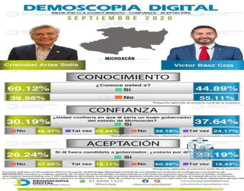 Asimismo, en lo referente al nivel de aceptación, el edil patzcuarense obtuvo un 23.19 por ciento y el Senador 26.19 por ciento, en cuanto al conocimiento, Báez Ceja obtuvo 44.89 por ciento y Cristobal Arias 60.12 por ciento.