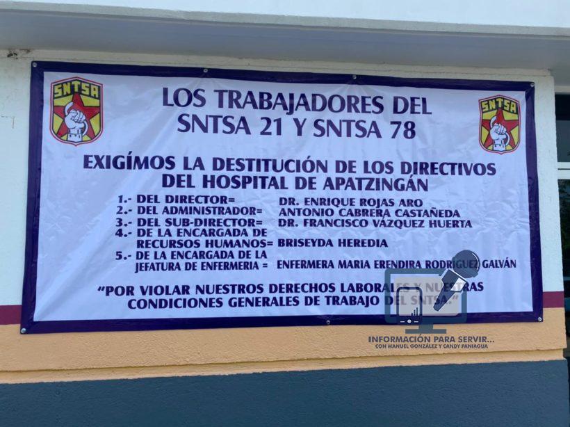 A la movilización están sumados trabajadores que pertenecen a la sección 21 y 78 del Sindicato Nacional de trabajadores de la Salud, quienes expusieron que están cansados del trato déspota y prepotente de los directivos que encabeza el Dr. Enrique Rojas Haro, de ahí que se han organizado para demandar a titular de la SSM, Dra. Diana Celia Carpio Ríos, que remueva al director, subdirector, administrador, jefa de recursos humanos y la recientemente impuesta jefa de enfermería.